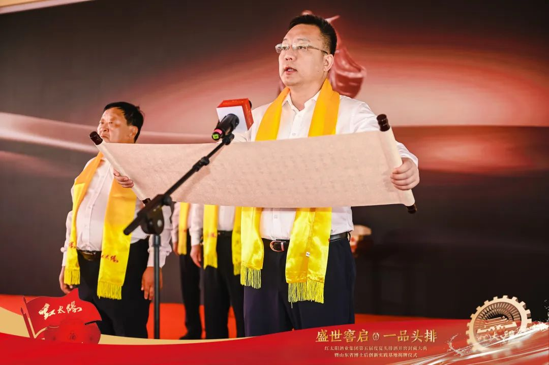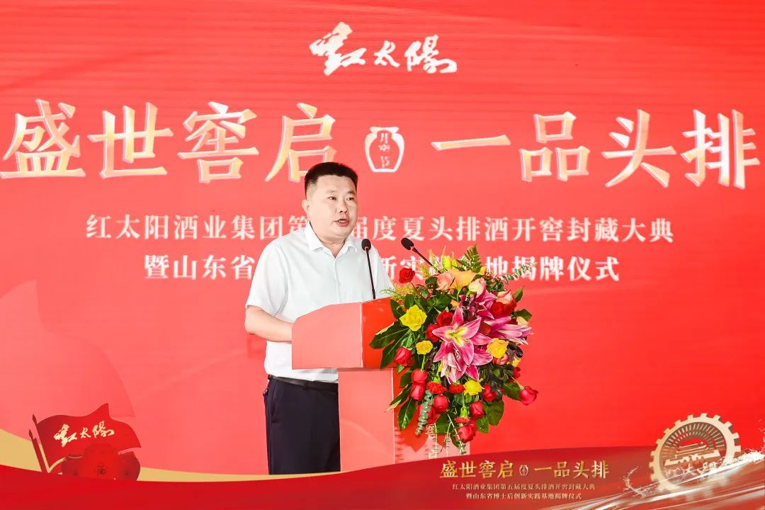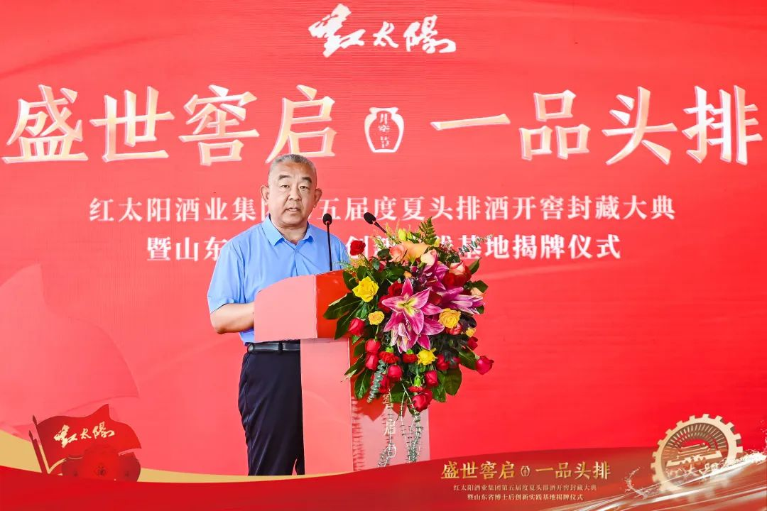 嘉祥县人民政府副县长朱亚峰在致辞中对红太阳开窖节的盛大举办给予了高度评价,他表示,嘉祥县历来高度重视工业发展,重视企业研发和人才引进工作。近年来,先后出台一系列政策,鼓励本地企业与科研院所、高校开展合作,引进技术做大做强走“产学研一体化”的科学发展之路。红太阳酒业以品质为核心驱动力,持之以恒打造品牌,成功引领消费市场,成为嘉祥的一张亮丽名片。通过举办开窖节、封藏大典活动,让更多消费者感受到头排酒的珍贵和稀缺价值,也展现了一种用时不计岁月、用料不计成本的酿造精神。