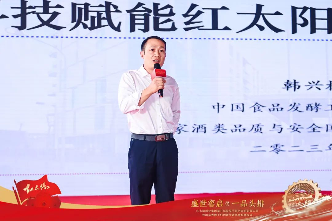 中国食品发酵研究院领导中国酒业协会白酒技术委员会委员、中国食品发酵工业研究院白酒中心主任、教授级高级工程师、国家一级品酒师韩兴林现场分享双方在技术攻关、工艺创新等方面取得的合作成果,并对红太阳酒业长期坚持推进传统与科技的完美结合,始终走在行业前端的发展理念,表达了大力支持和高度赞誉。