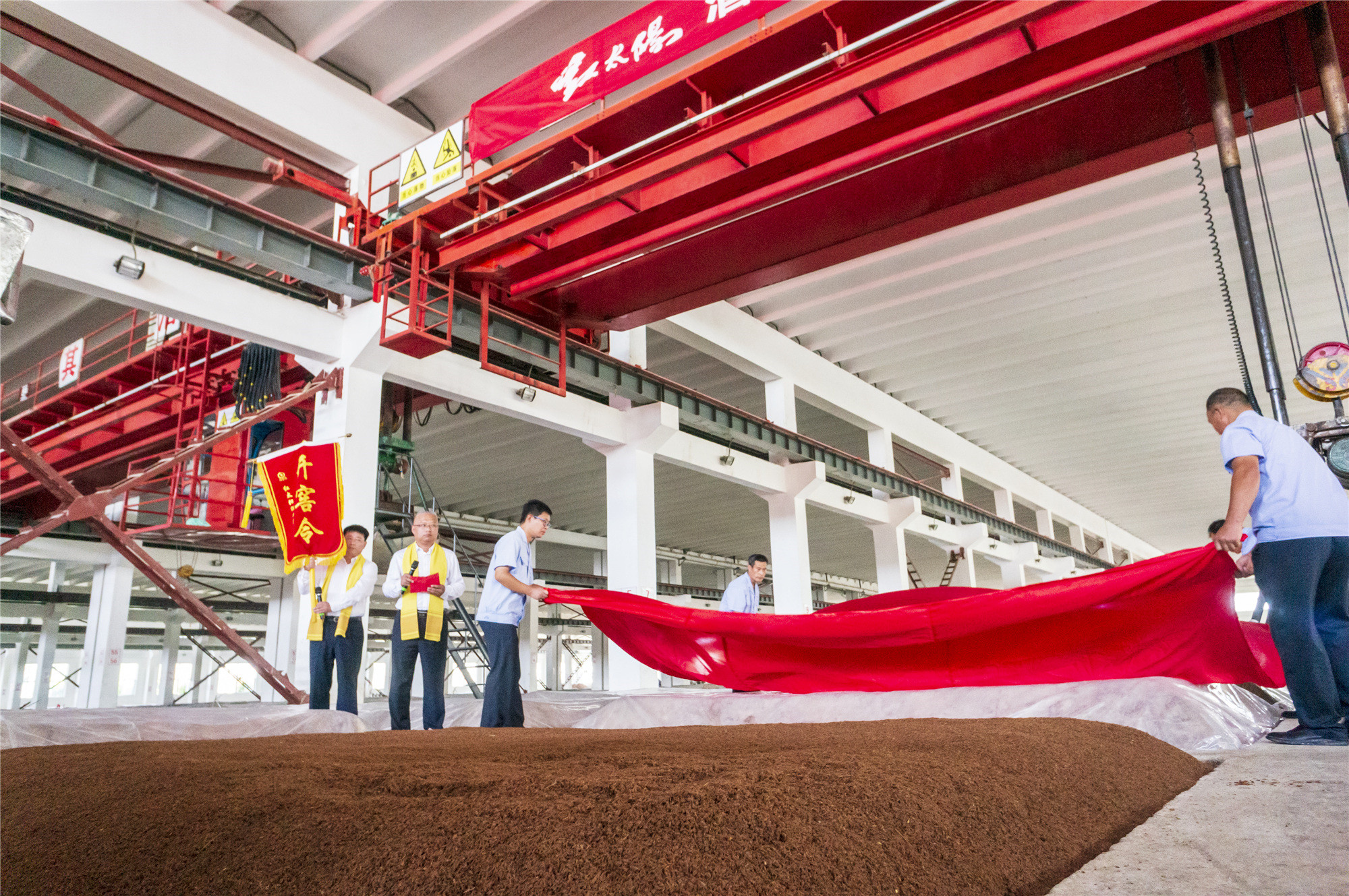 祭祀典礼圆满礼成之后,任春玉董事长向酿酒师傅们授予开窖令旗。伴随着“开窖喽,开窖喽,开窖喽”三声高呼,酿酒师们迈着整齐的步伐前往车间开窖,呼声中透露出那份对于酿造头排酒的期盼之心和兴奋之情。